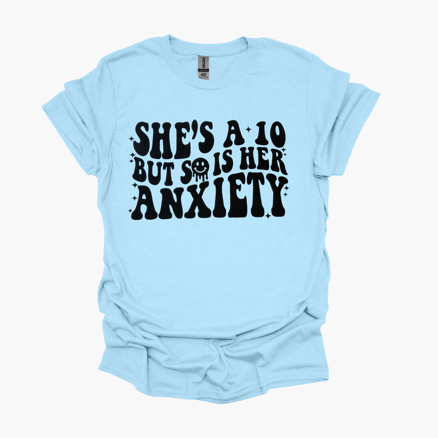 Fend off anxiety in style with this sassy 'Anxiety is a 10' graphic tee. You'll feel relaxed and comfortable with its chill fit, while making a bold statement with its cheeky message. Get ready to show off your attitude of the day with this tee!