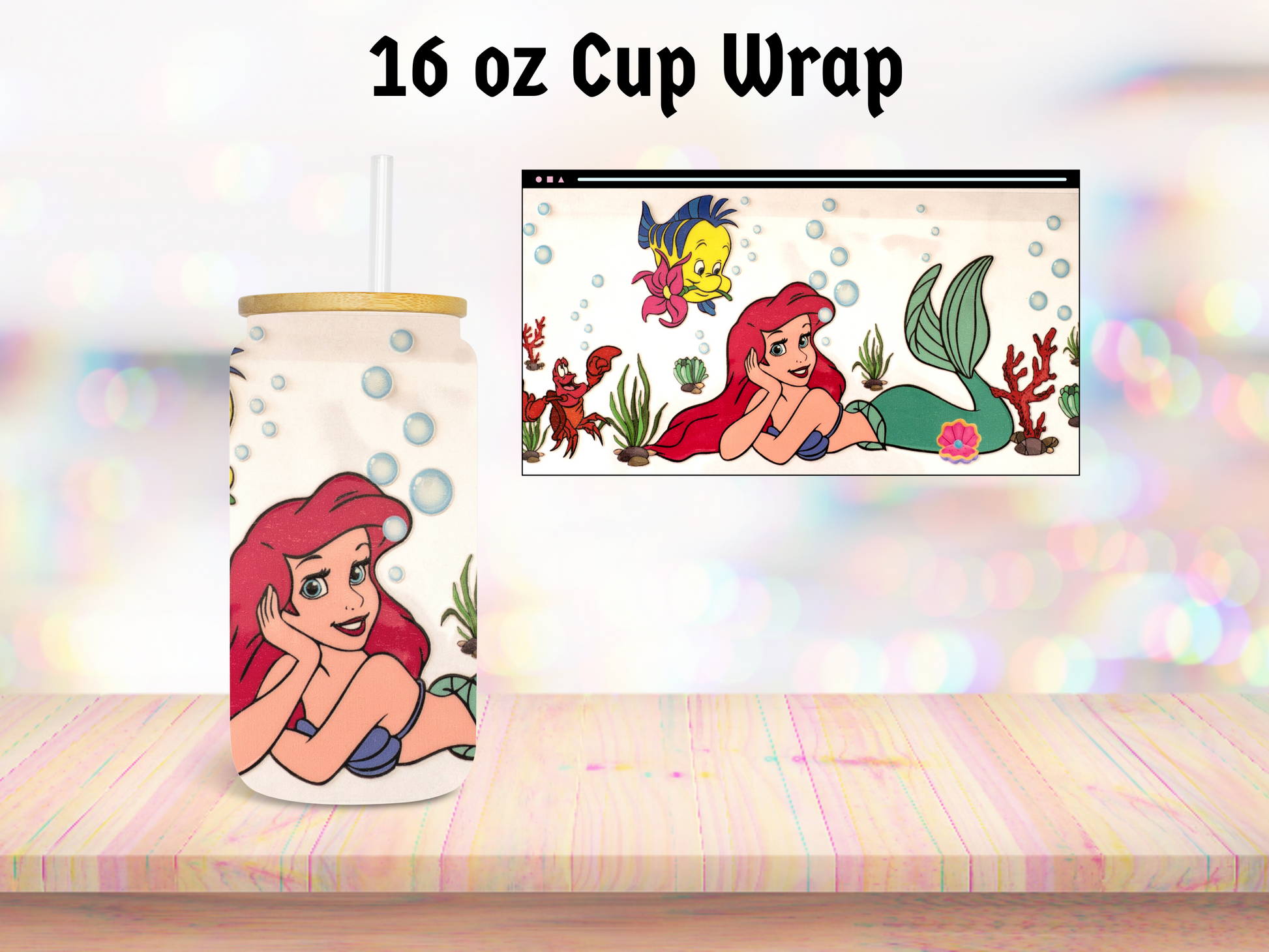 Introducing our Ariel and Friends 16oz UV DTF Cup Wrap - the perfect blend of style, durability, and versatility for your favorite beverages! Specially crafted to fit 16oz glass cans, this innovative cup wrap is designed to elevate your drinking experience to new heights.