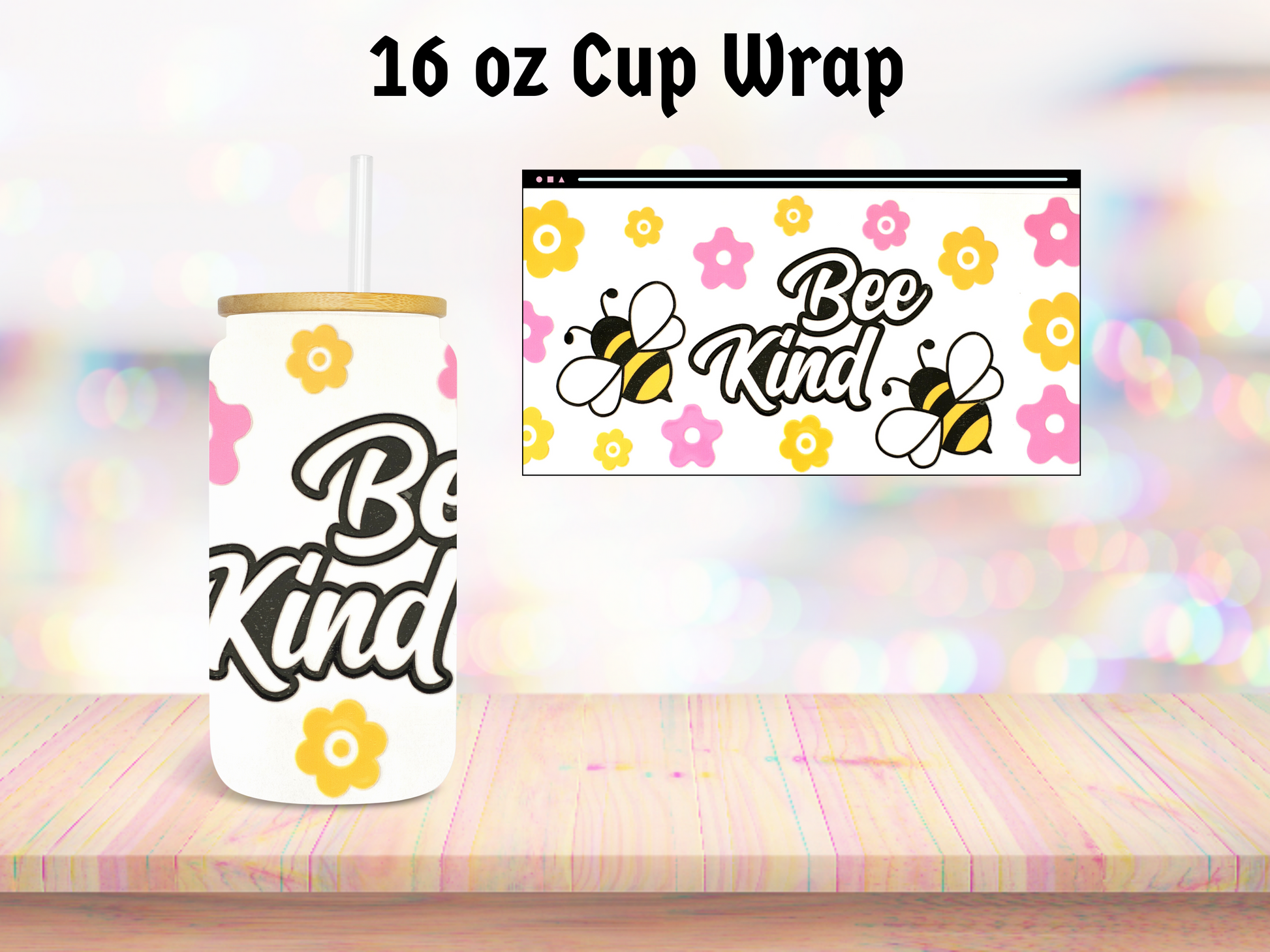 Introducing our Bee Kind 16oz UV DTF Cup Wrap - the perfect blend of style, durability, and versatility for your favorite beverages! Specially crafted to fit 16oz glass cans, this innovative cup wrap is designed to elevate your drinking experience to new heights.