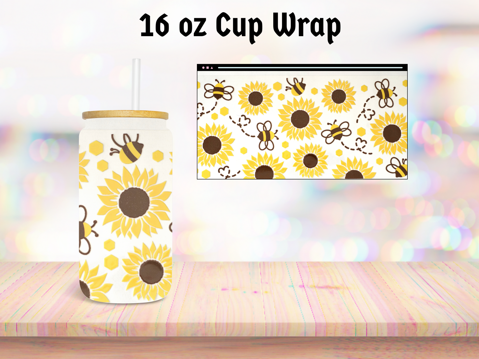 Introducing our Bees and Sunflowers 16oz UV DTF Cup Wrap - the perfect blend of style, durability, and versatility for your favorite beverages! Specially crafted to fit 16oz glass cans, this innovative cup wrap is designed to elevate your drinking experience to new heights.