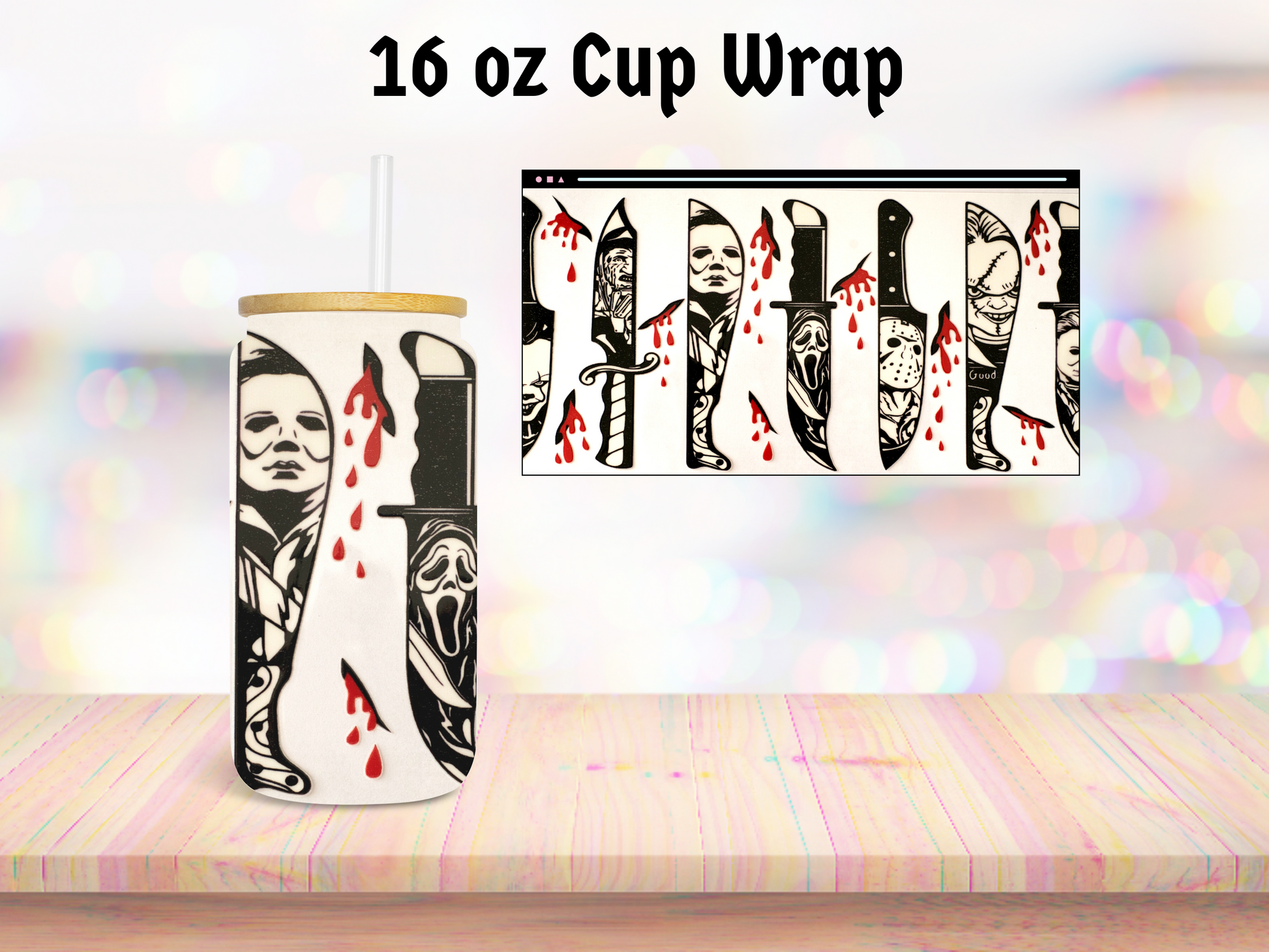 Introducing our Horror Knives 16oz UV DTF Cup Wrap - the perfect blend of style, durability, and versatility for your favorite beverages! Specially crafted to fit 16oz glass cans, this innovative cup wrap is designed to elevate your drinking experience to new heights.