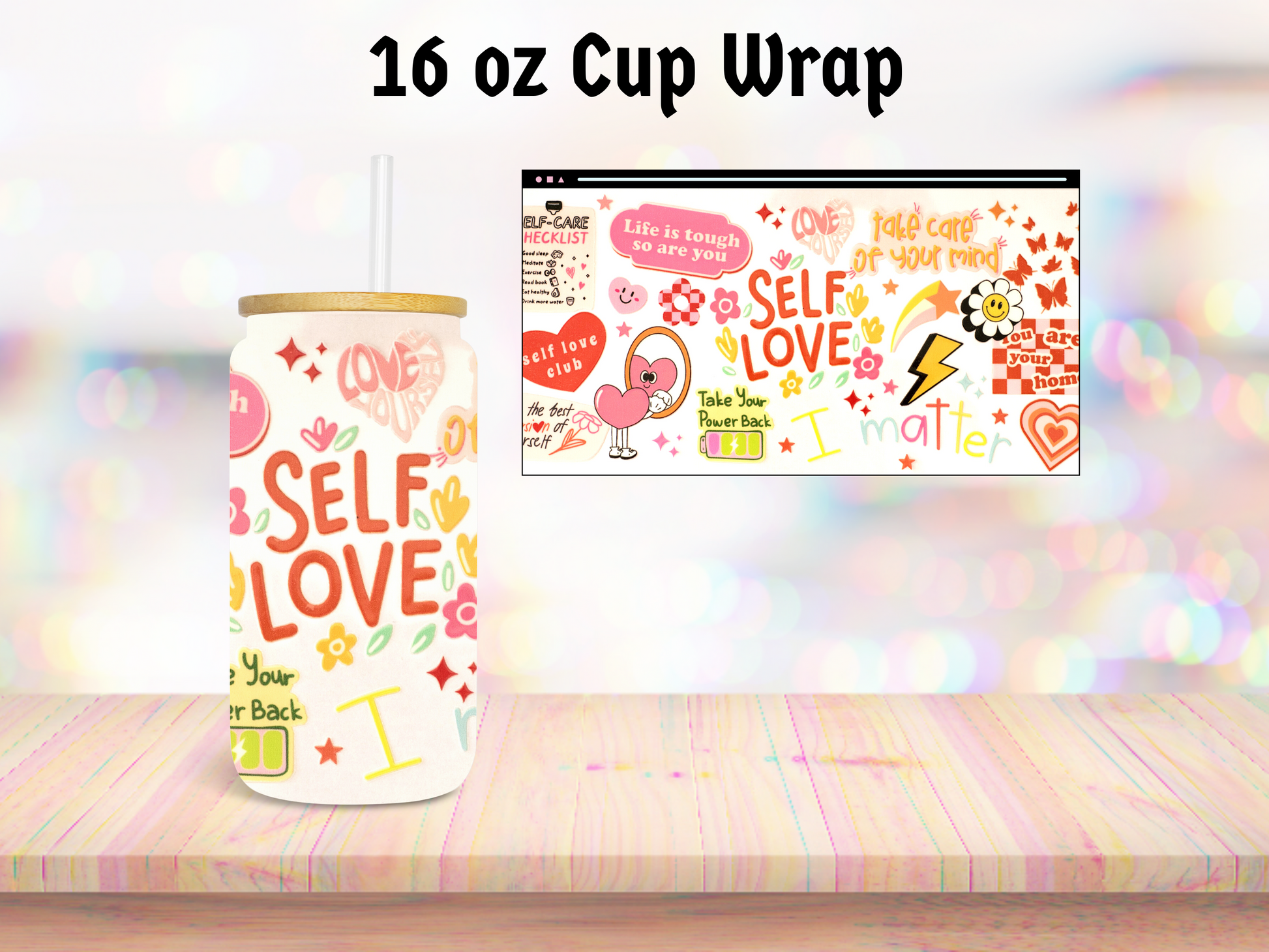 Introducing our Self Love 16oz UV DTF Cup Wrap - the perfect blend of style, durability, and versatility for your favorite beverages! Specially crafted to fit 16oz glass cans, this innovative cup wrap is designed to elevate your drinking experience to new heights.