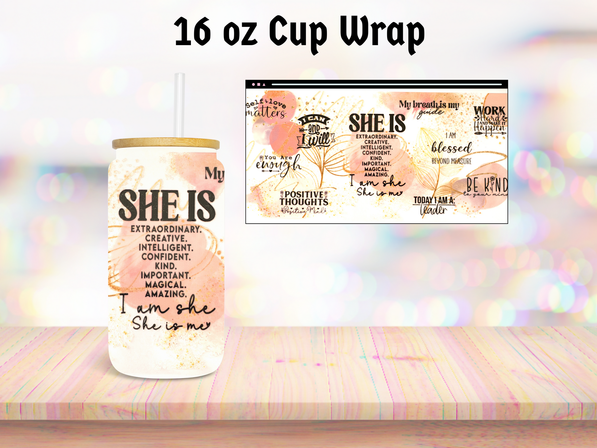 Introducing our She Is.. 16oz UV DTF Cup Wrap - the perfect blend of style, durability, and versatility for your favorite beverages! Specially crafted to fit 16oz glass cans, this innovative cup wrap is designed to elevate your drinking experience to new heights.